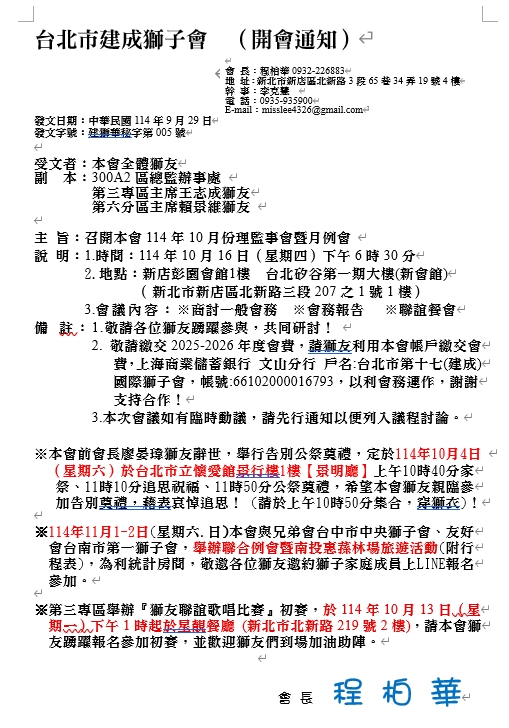 114年11月1-2日(星期六.日)舉辦與台中市中央獅子會、台南市第一獅子會聯合例會暨南投惠蓀林場旅遊活動