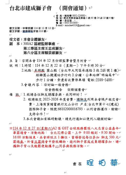 台北市建成獅子會 重要訊息