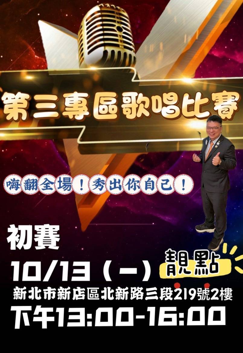 ※第三專區舉辦『獅友聯誼歌唱比賽』初賽,於114年10月13日(星 期ㄧ)下午1時起於靚點餐廳 (新北市北新路219號2樓),請本會獅友踴躍報名參加初賽,並歡迎獅友們到場加油助陣。