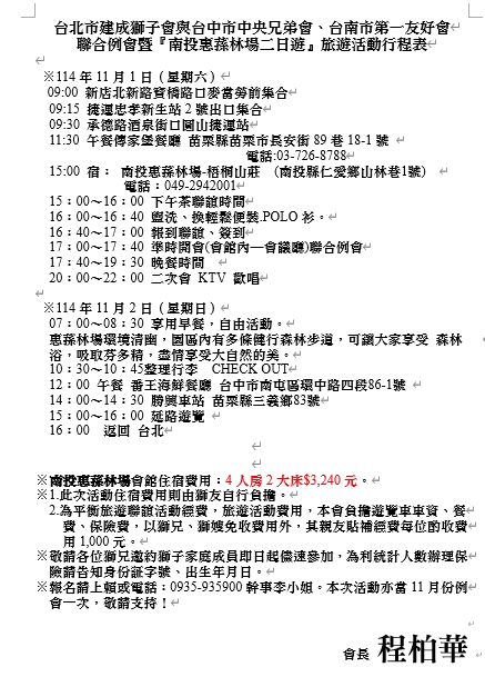 114年11月1-2日(星期六.日)舉辦與台中市中央獅子會、台南市第一獅子會聯合例會暨南投惠蓀林場旅遊活動